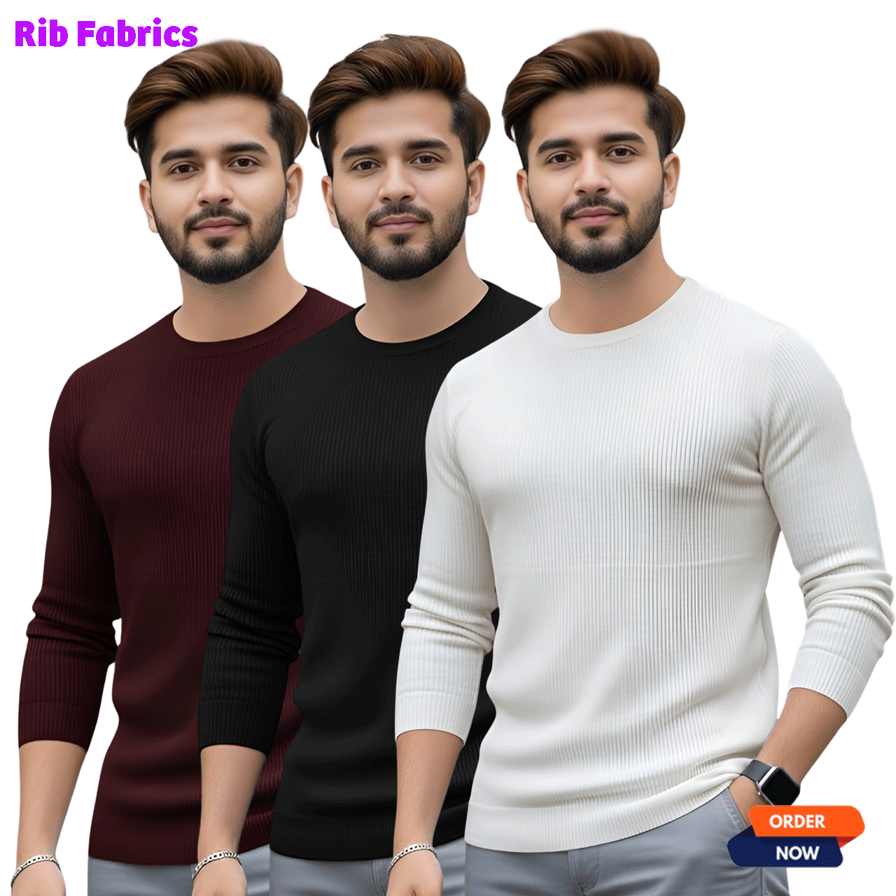 3 Pcs Men’s Premium 2/2 Rib Full Sleeve T-shirt – White+Black+Purple